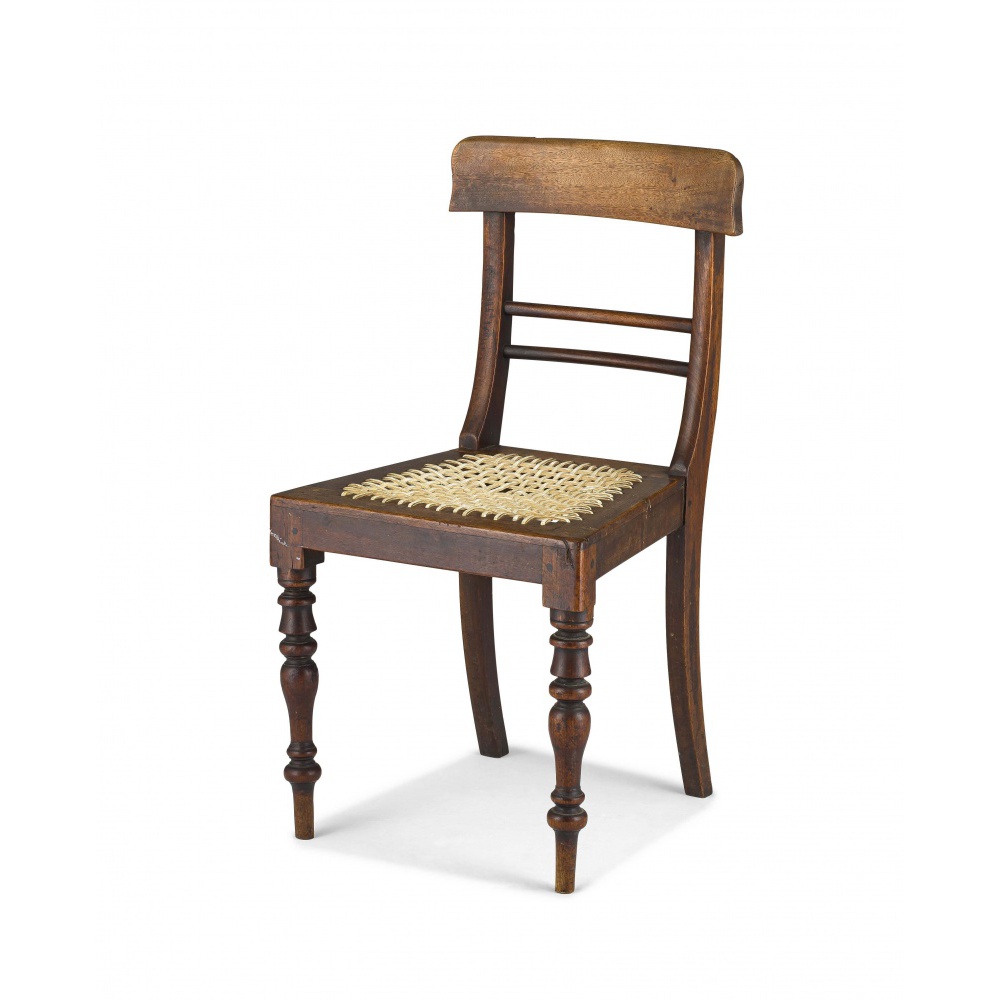 the shaped top rail above a pair of horizontal spindles between curved supports, riempie seat, on ring-turned tapering legs with stile feet