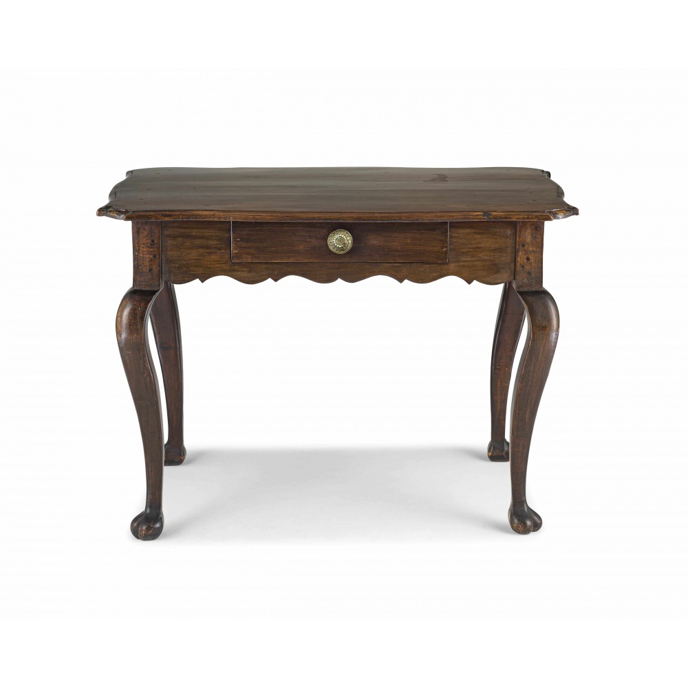 the rectangular-shaped moulded wavy top with carved re-entrant corners, above a wavy apron centered by a frieze drawer, raised on restrained cabriole legs with stylised paw feet, 77cm high, 108cm wide, 76cm deep