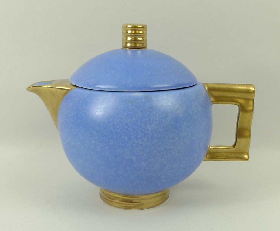 A Carlton Ware bachelor tea set, Moderne pattern in blue ground with gold handles, comprising tea pot, milk jug, sugar bowl (one handle broken), tea cups, two saucers, and a tea plate. (7)