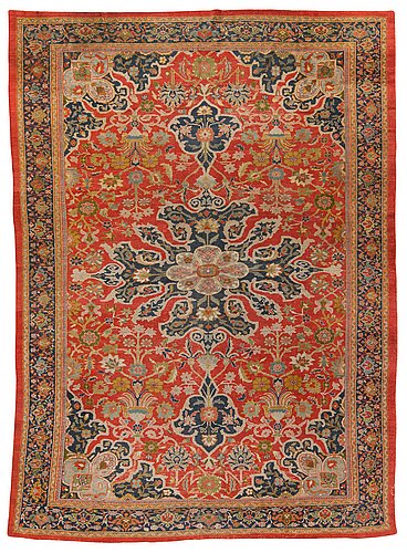 400,5 x 297 cm. A red ground with a large polychrome medallion, stylized flower urns, palmettes and corner ornaments. A dark blue main border with a palmette, arabesque, pomegranate and flower vine