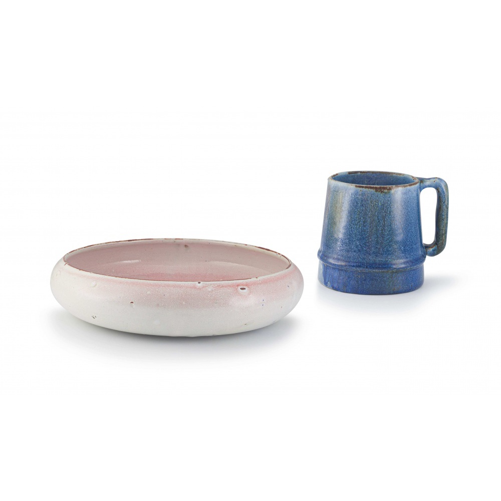 raised on a low foot, hairline crack, chips, impressed CERAMIC STUDIO, 26cm diameter; and a Ceramic Studio blue-and-speckled green-glazed tankard, impressed CERAMIC STUDIO 1939 040M, 10,9cm high