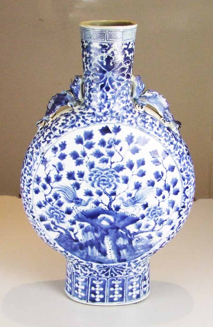 A Chinese blue and white moon flask, with dragon handles, decorated with phoenix amidst trees