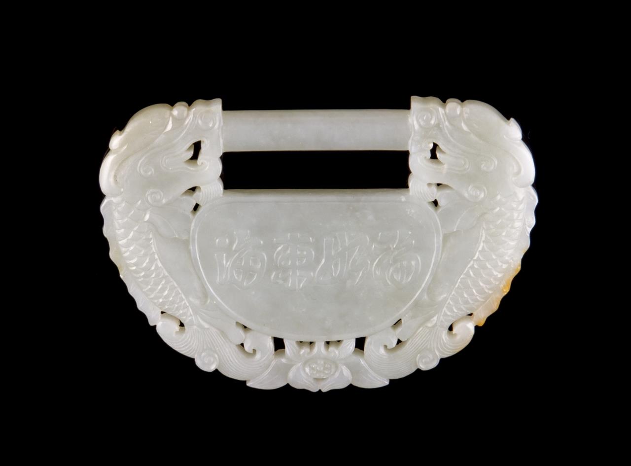 A Chinese light celadon jade pendant, in the form of a lock carved with sea monsters