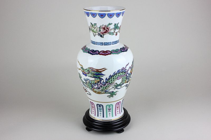 A Chinese porcelain vase, The Dance of the Celestial Dragon, marked FM1985 depicting dragon chasing the flaming pearl, with stand, 26.5cm