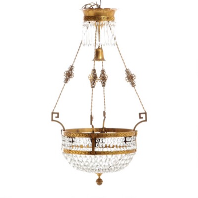 A circa 1900 brass and bronze chandelier with cut glass prisms, four internal sockets for electricity. H. 82. Diam. 44 cm.