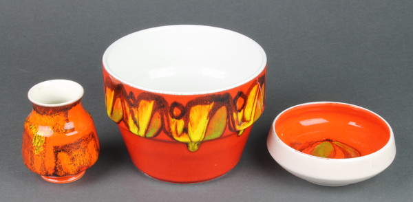 the base marked Poole England 73 monogrammed CB 6 1/2", a squat shaped vase marked 31 4", a circular Pool dish marked 86 5"
