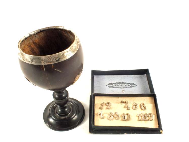 A Coconut cup on stand with white metal mounts and a box with white metal clip on numbers