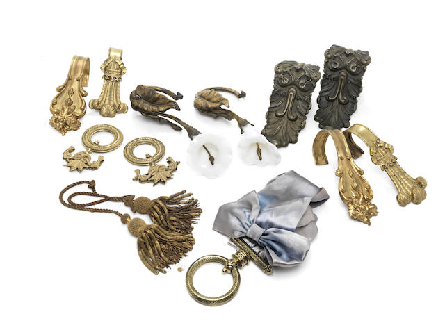 the tie backs comprising comprising a pair of opaline glass Calla lily tie backs, a pair of Prince of Wales feathers pressed brass tie backs and two pairs of foliate tie backs