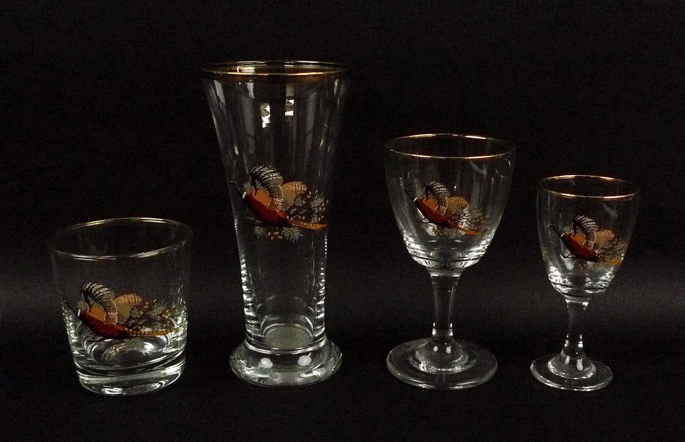 A collection of glassware decorated with pheasants, comprising six cooler tumblers, six tumblers, five wine glasses, and six por