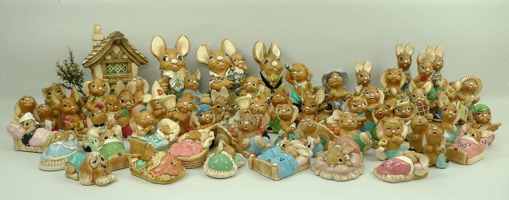 A collection of Pendelfin figures comprising 'Snuggles', two 'Wakey', 'Dodger', 'Sleepy', 'The Thumper', 'Twins', two 'Peeps', 'Casanova', 'Boswell', 'Humphrey', 'Pooch', two 'Barrow Boy', 'Barney', 'Dandy', 'Bongo', 'Victoria', 'Clanger', 'Uncle Soa