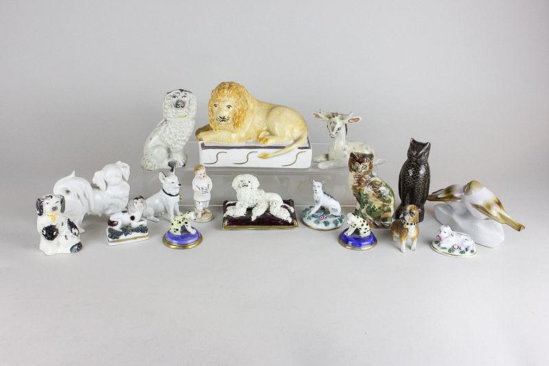 A collection of various Staffordshire pottery and other figures of animals