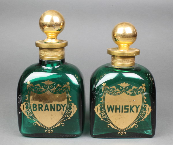 A Continental green glass flattened whisky decanter and stopper with gilt decoration 8", a ditto brandy decanter and stopper 9 1/2" SOLD