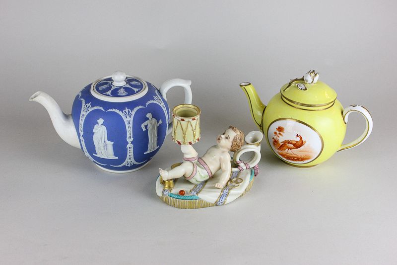 A Continental porcelain candlestick modelled as a small boy playing with instruments, a Jasper ware teapot and a Crown Staffordshire teapot depicting a pheasant in rust on yellow ground (a/f)