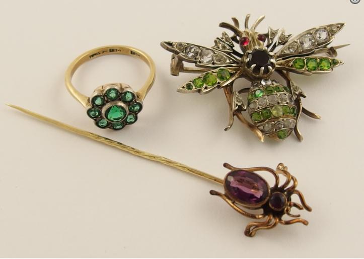 A continental white metal gem set bee brooch, a 9ct spider tie pin and an 18ct green gem stone flower ring