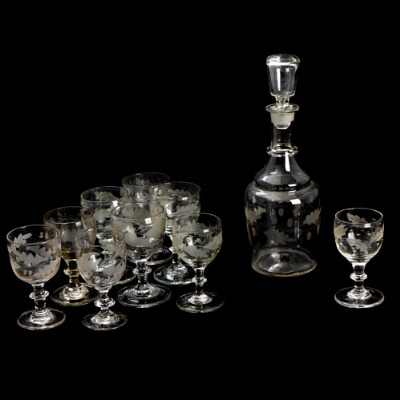 A Danish 19th century decanter and 9 wine glasses engraved with oak leaves
