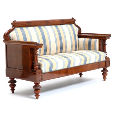A Danish 19th century Late Empire mahogany sofa and two armchairs, carved with foliage