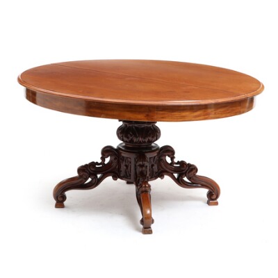 A Danish mid 19th century Neo Rococo mahogany dining table, richly carved with foliage, Mid 19th century