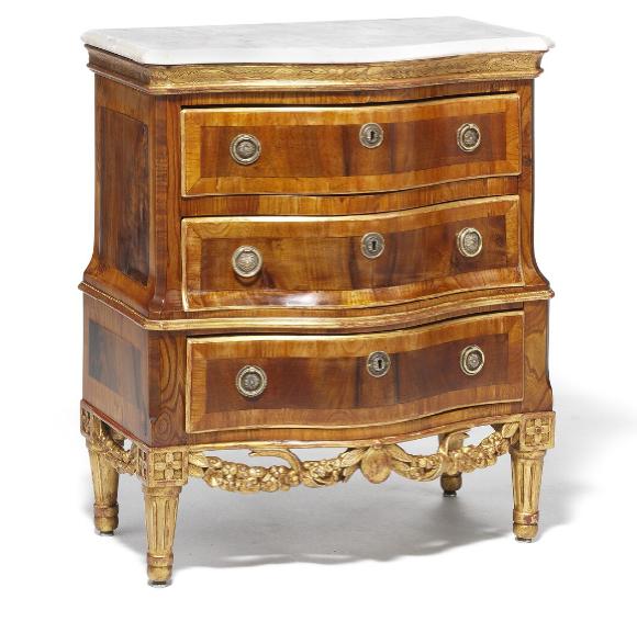 A Danish Transition giltwood, elm and walnut commode with later white marble top