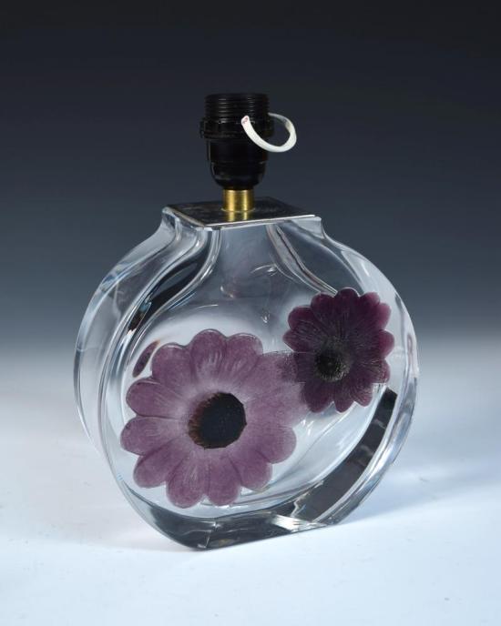 A Daum Coppelia pattern pate de verre glass table lamp base, the circular glass body with inset pate de verre purple flowers, etched marks h:29 w:21.50 cm