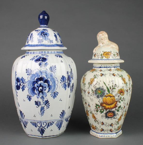 A Delft blue and white pottery vase and cover of panelled form the base marked Delft 16" (lid f and r)