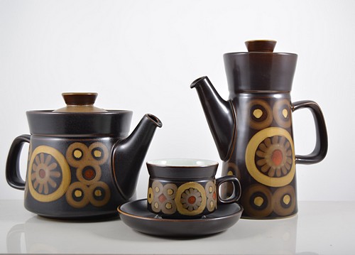 A Denby ''Arabesque'' six place tea/dinner service, including casserole, lidded vegetable, tea and coffee pots