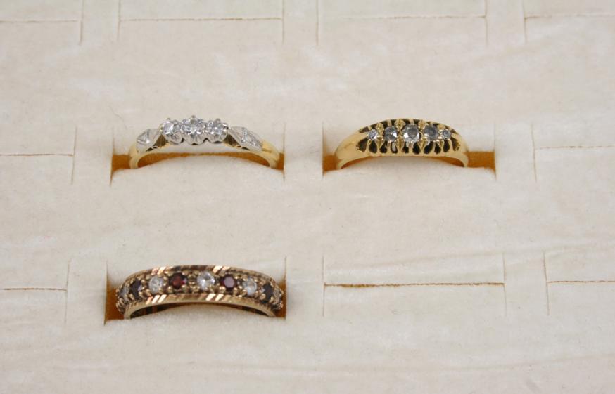 A DIAMOND FIVE STONE RING set with five graduated circular-cut diamonds in 18ct. gold, size K 1/2, together with a diamond three stone ring, set in 18ct. gold and platinum, size O, and a garnet and white stone eternity ring, size O.