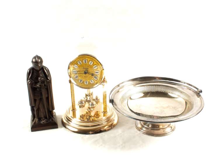A dome clock, Knight table lighter and a Silver plated fruit basket