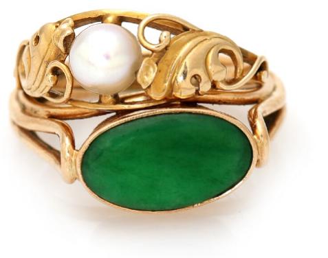 A jade ring set with an oval-cut cabochon jade, mounted in 18k gold. Size 58. Pearl ring set with a cultured pearl