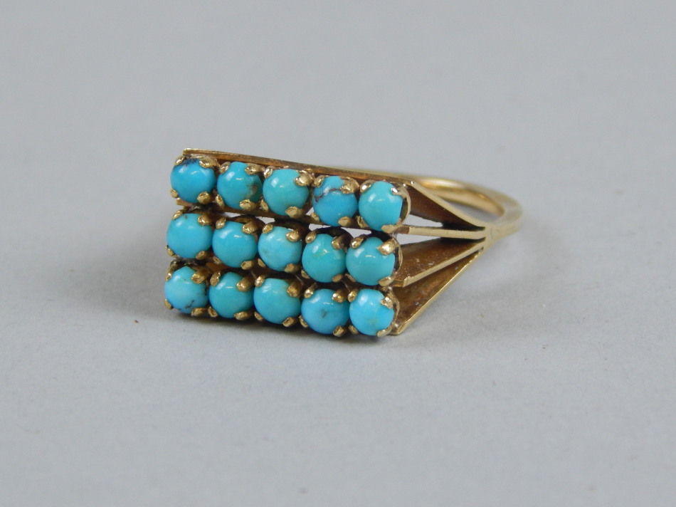 A dress ring, set with fifteen turquoise stones, in an abstract design, yellow metal, unmarked, 4.9g all in