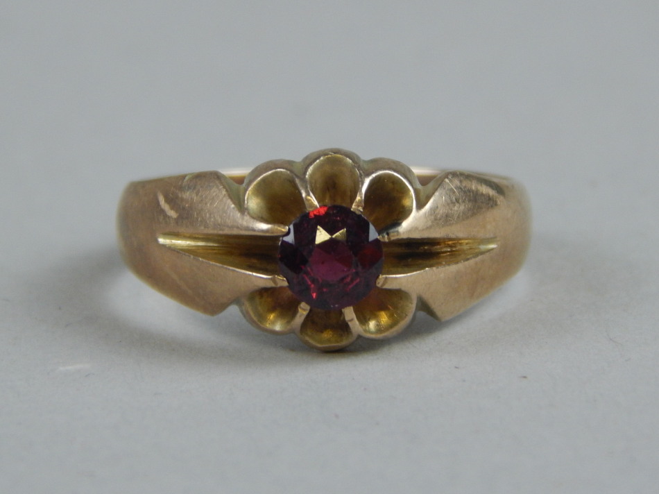 A dress ring, set with red stone, yellow metal, marked 9ct, 3.8g all in