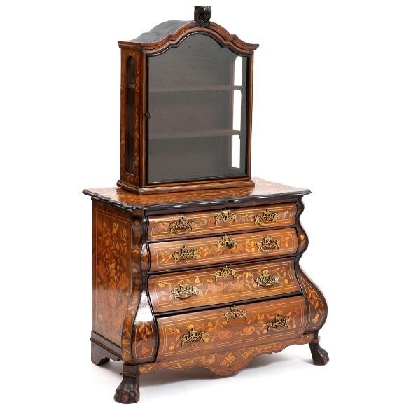 A Dutch 18th century Baroque inlaid walnut chest of drawers with display cabinet