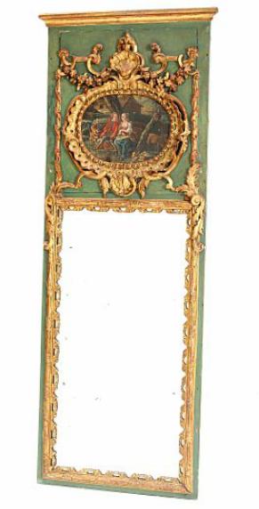 A French 19th century Rococo style greenpainted and gilded mirror, richly decorated with rocailles and foliage
