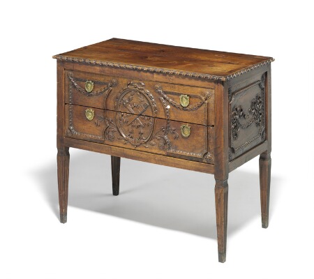 A French Louis XVI walnut commode, carved with ribbons, bows and torches