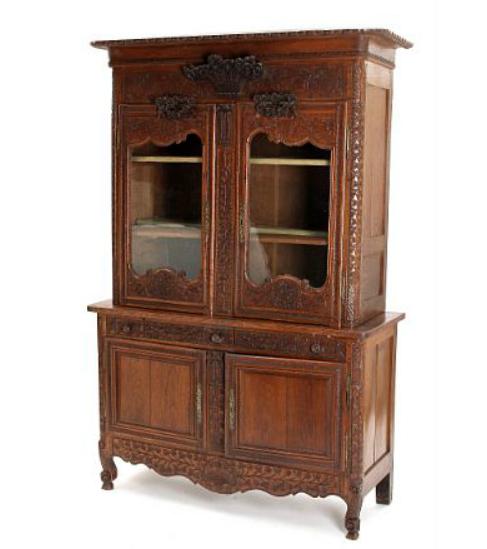 A French oak Provence display cabinet, front with two glassdoors, three smaller drawers and two doors