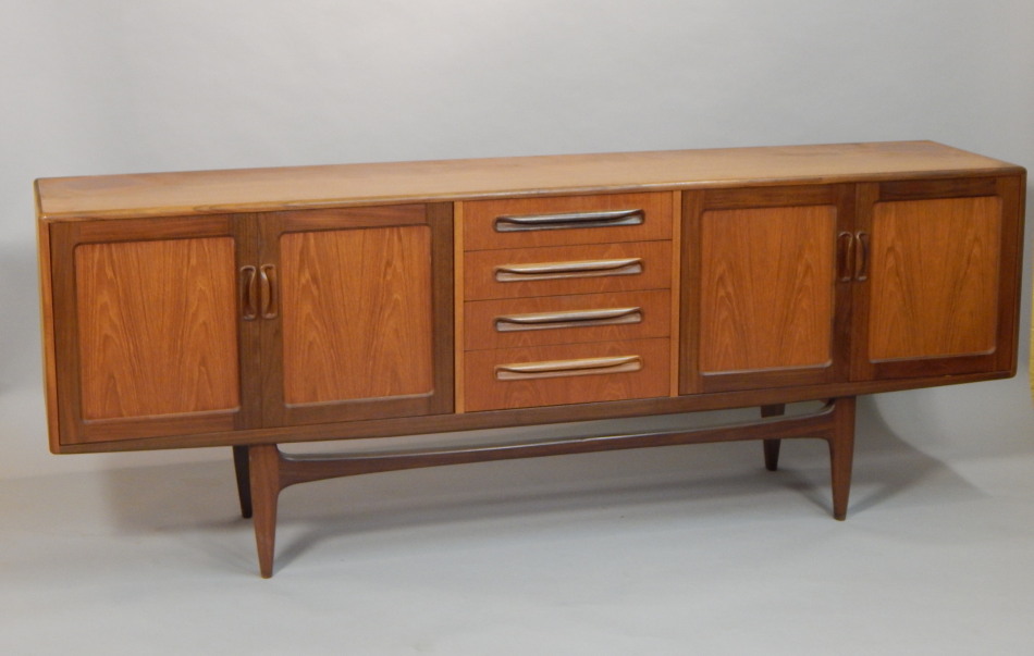 with four central drawers, flanked by two pairs of doors, on tapering base, 210cm wide