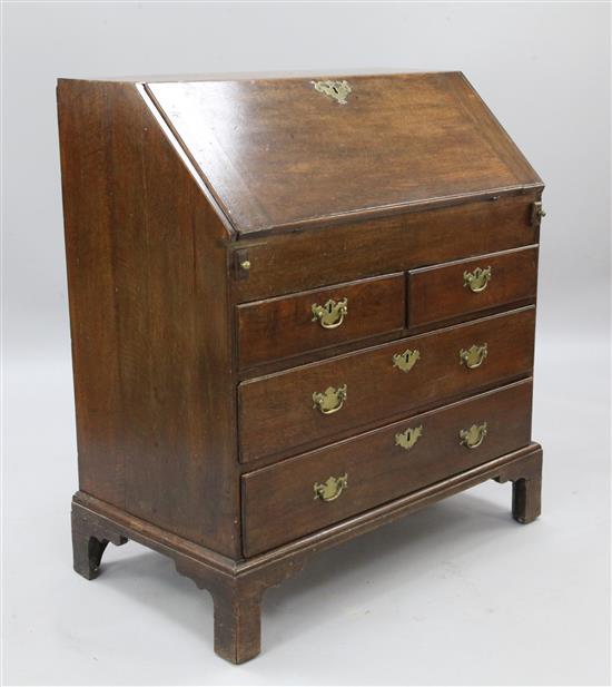 A George I oak bureau, stepped interior above a concealed well and two short and two long drawers, on bracket feet, W.3ft 2in.