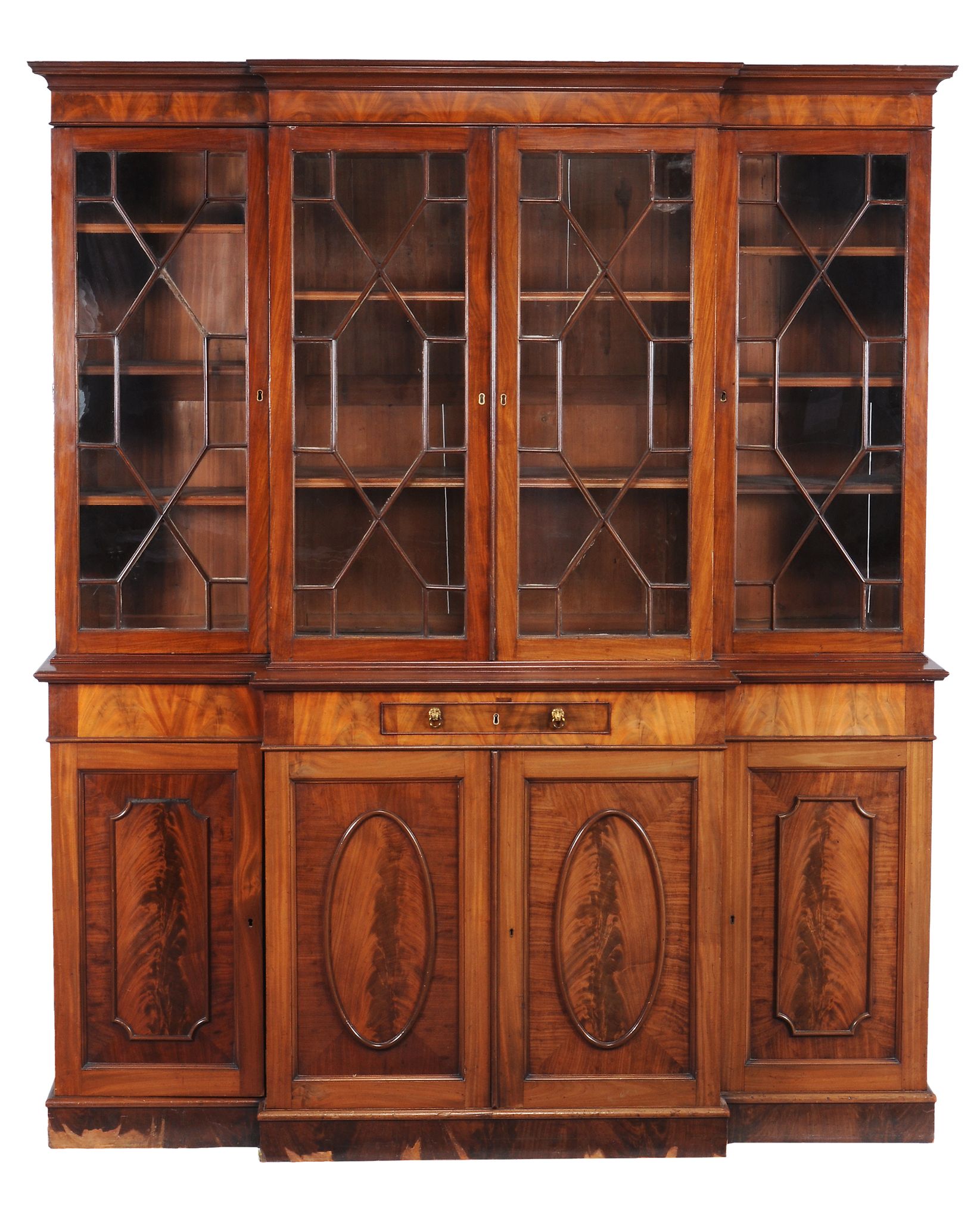 the moulded cornice above four astragal glazed cabinet doors opening to adjustable shelves, the base with central drawer opening to a leather inset writing surface, above four panelled cupboard doors, on a plinth base