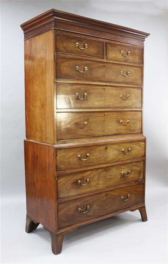 A George III mahogany chest on chest, with moulded cornice, two short and six graduated long drawers, on swept bracket feet, W.3ft 8in.
