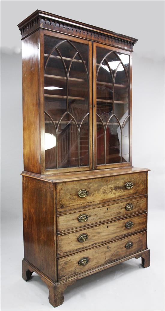 A George III mahogany secretaire bookcase, with moulded cornice over astragal glazed doors, secretaire drawer and three graduated long drawers, on bracket feet, W.3ft 8in. D.1ft 10in.