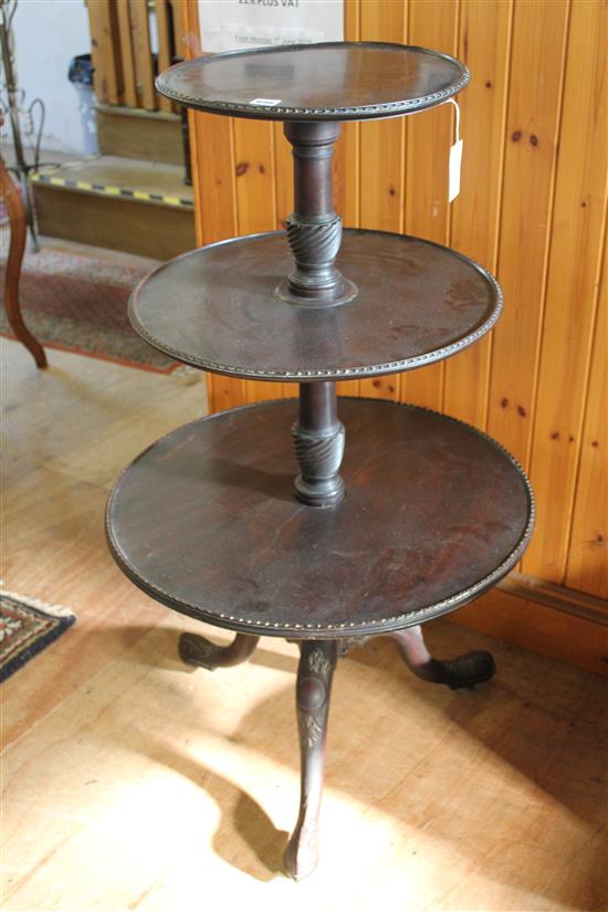 A George III mahogany three tier dumb waiter, with carved tripod base, W.2ft 2in