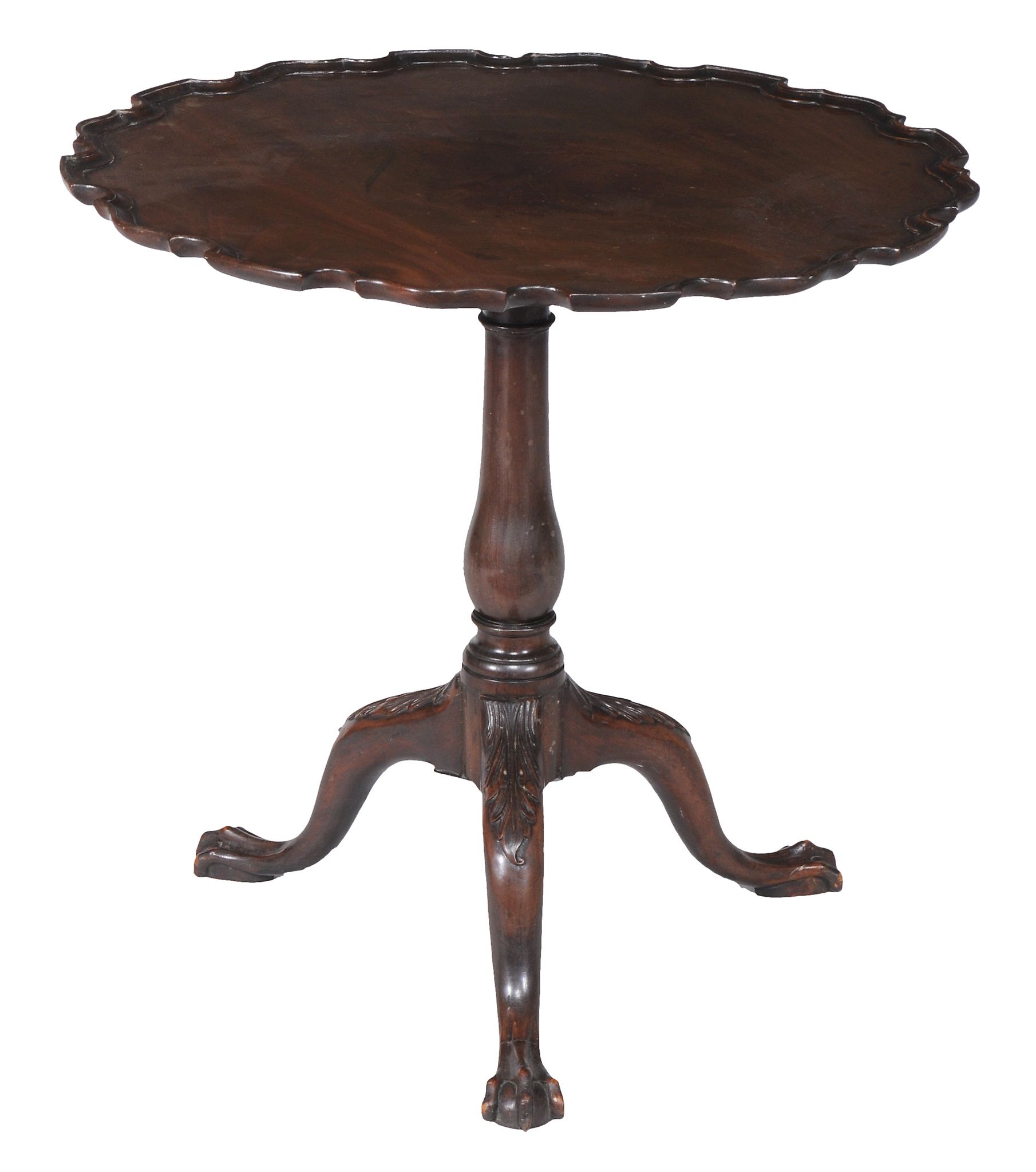 the top with piecrust edge above a turned baluster stem and three acanthus carved downswept legs terminating in claw and ball feet, the top 70cm diameter