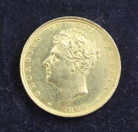 A George IV gold sovereign, 1829, occasional nicks, edge dents otherwise EF