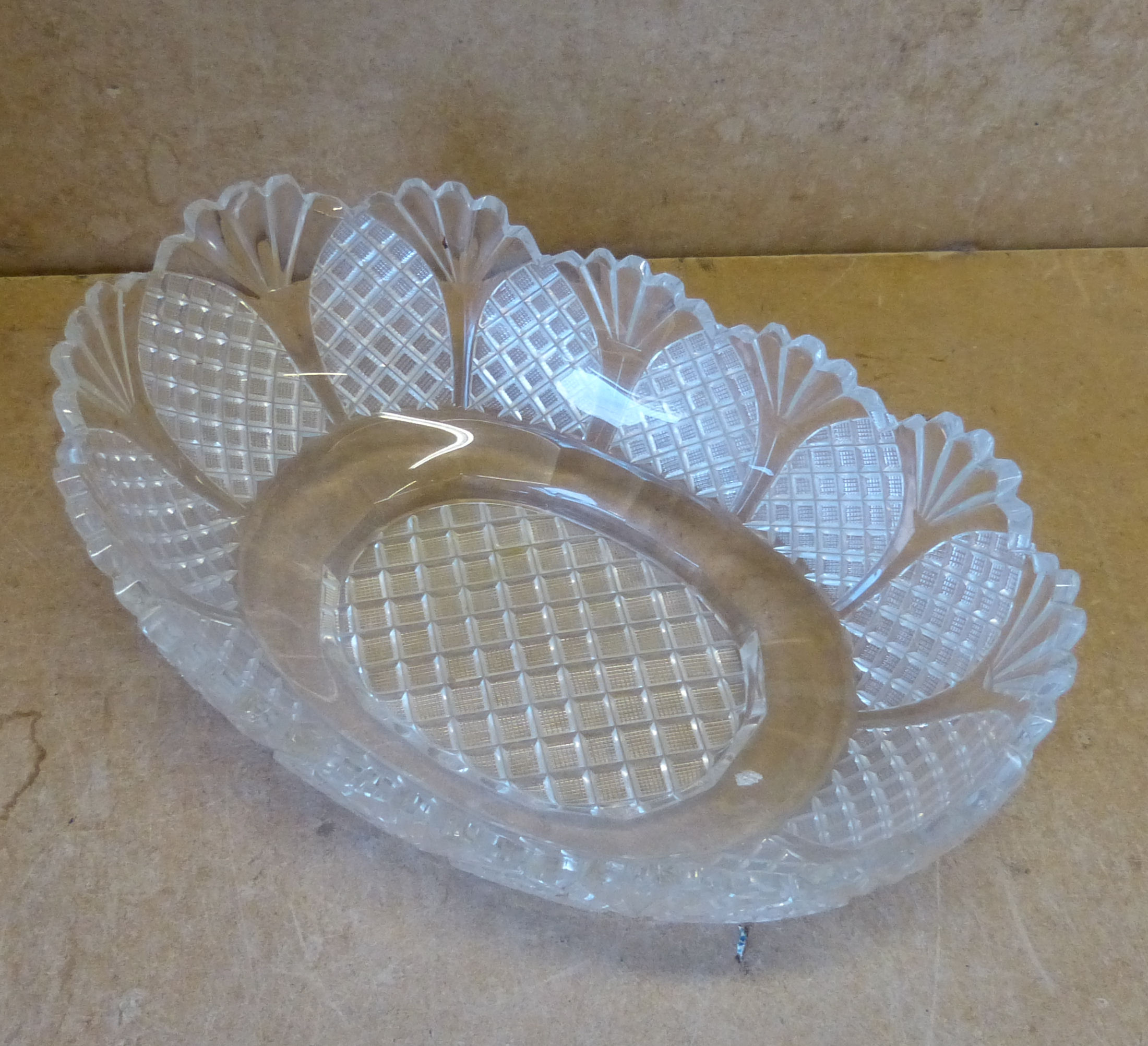 A Georgian Cut Glass Boat Shape Fruit Bowl having crinkled rim and all over tooth cut decoration