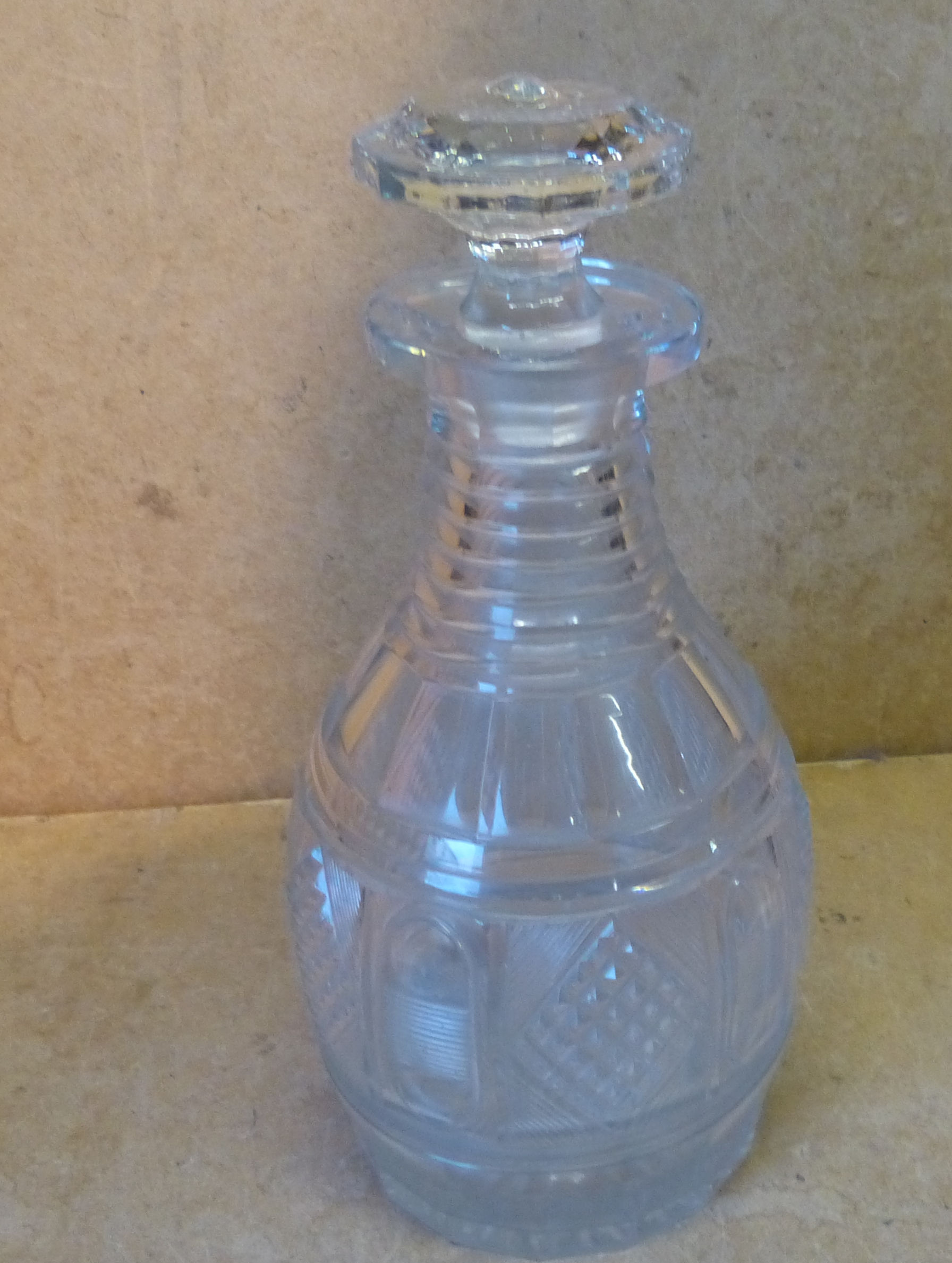 A Georgian Cut Glass Bulbous Thin Neck Decanter with mushroom shape stopper, ring neck, having all over chamfer and tooth cut de