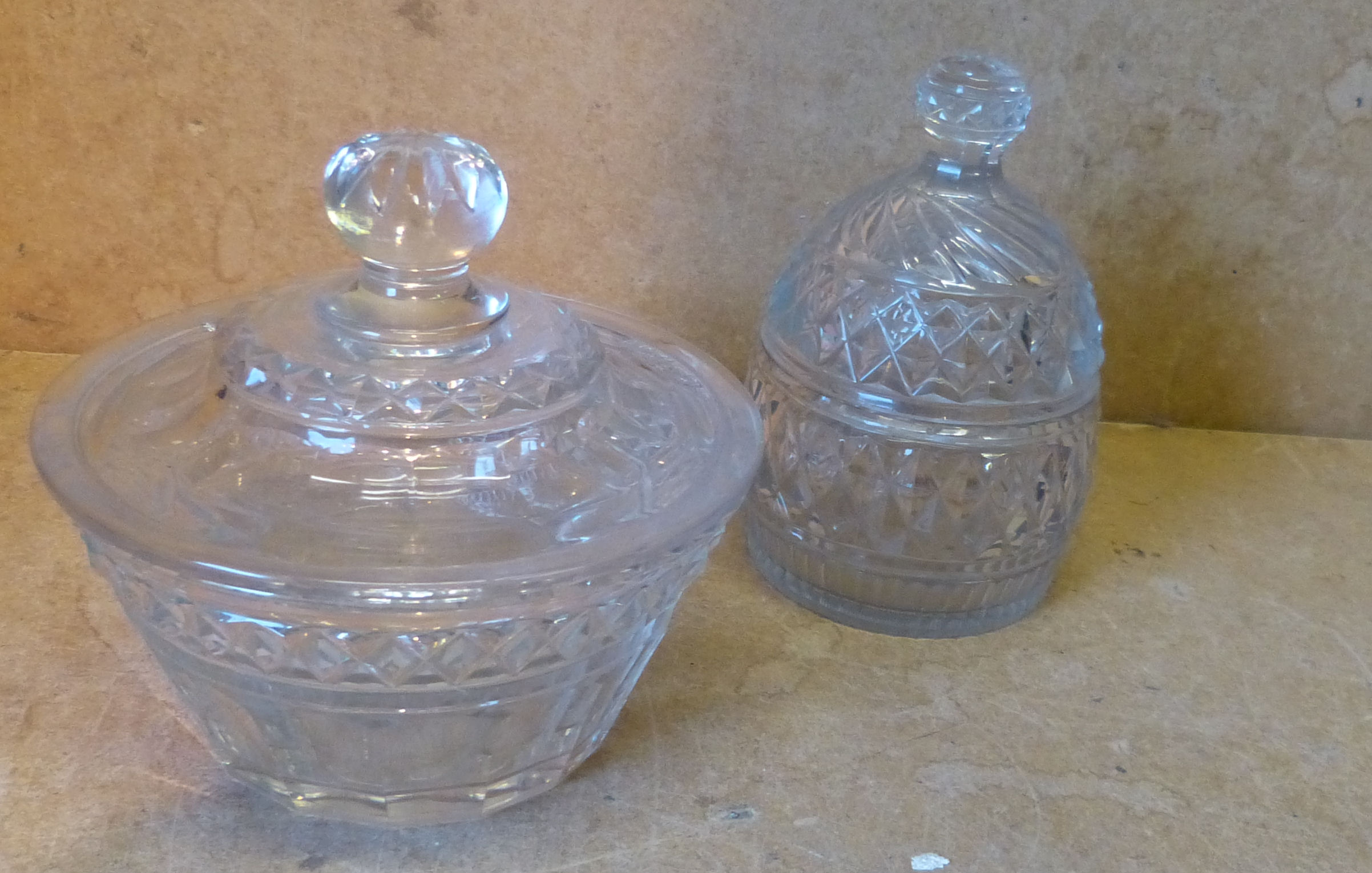 A Georgian Cut Glass Butter Dish with cover having tooth cut decoration, also a cut glass round lidded pot having star cut decor