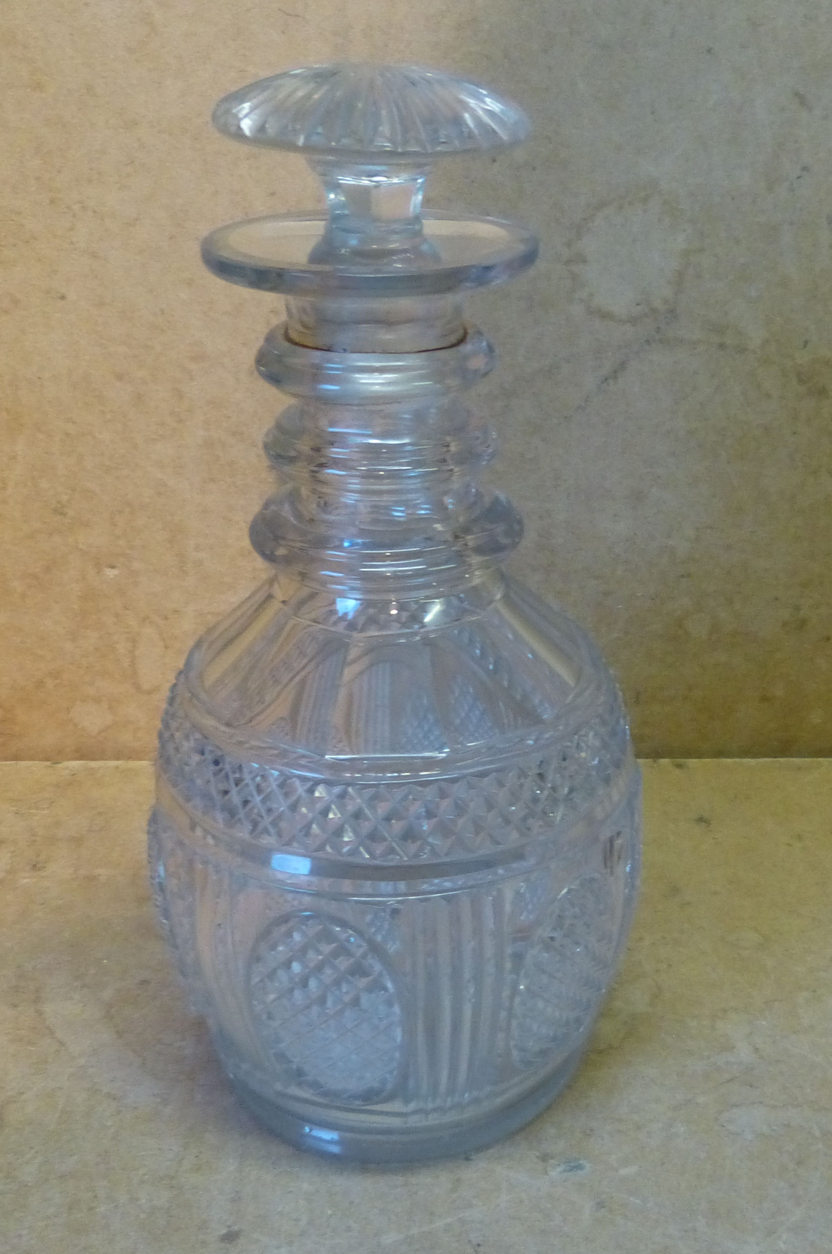 A Georgian Cut Glass Round Thin Neck Decanter having mushroom shape stopper with ring neck and all over tooth cut decoration