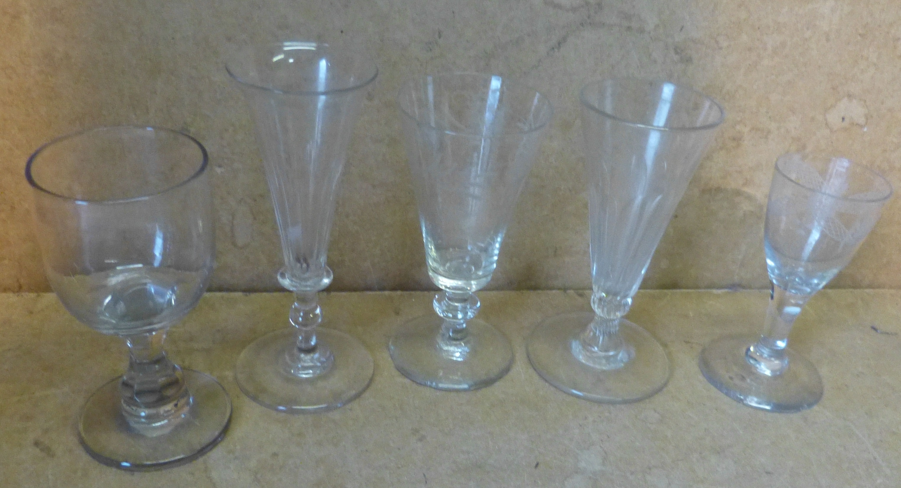 A Georgian Drinking Glass having etched swag decoration (base chipped) also 4 other drinking glasses