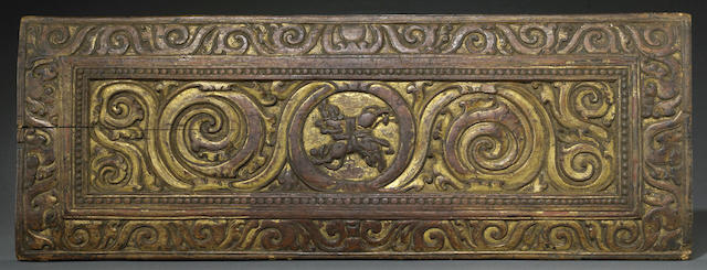 The center with a manuscript(?) bound to twin lions encircled by confident scrolling vines, bordered by pearl and foliate bands