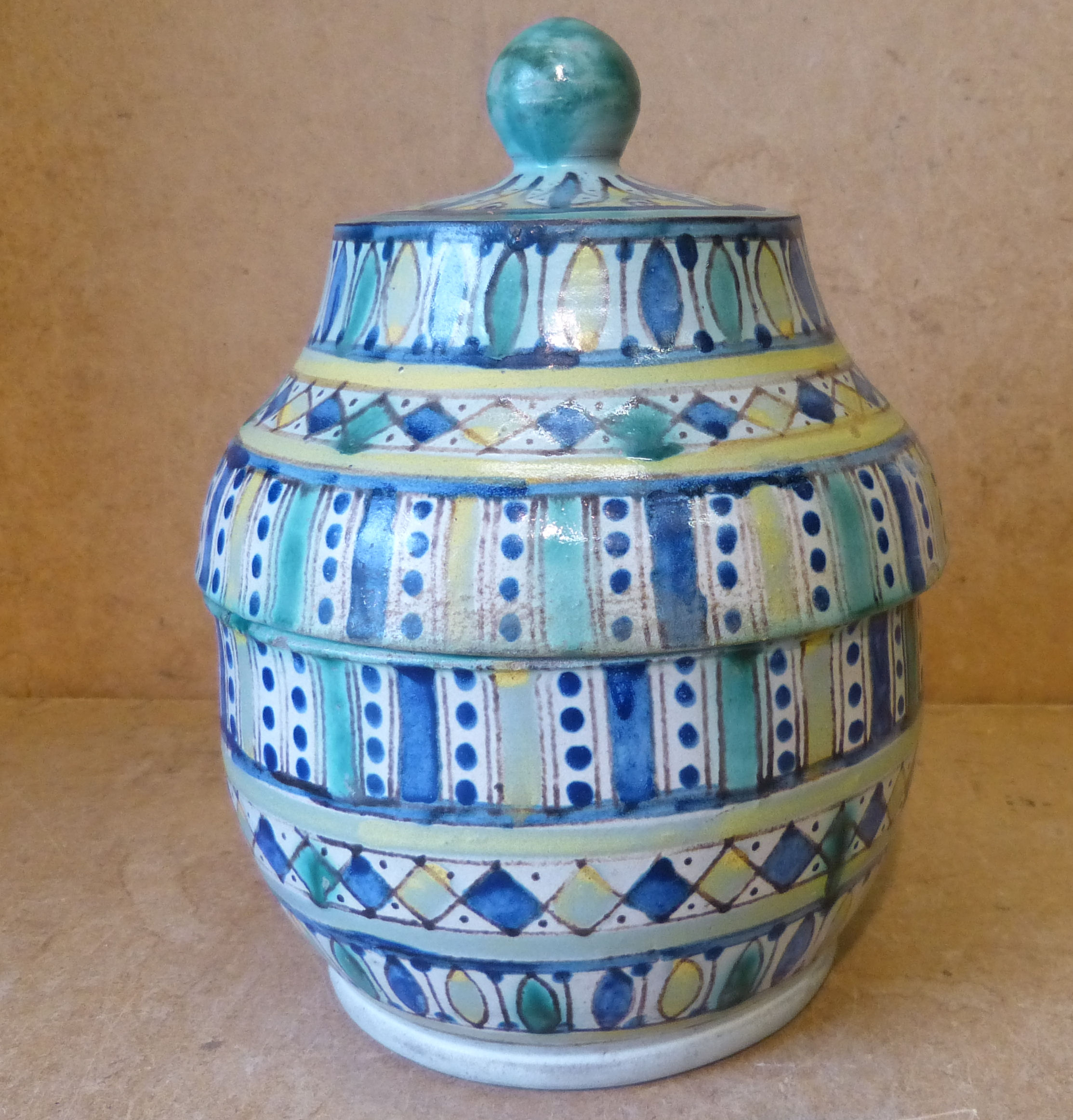 A Glazed Earthenware Round Lidded Pot on white ground having yellow