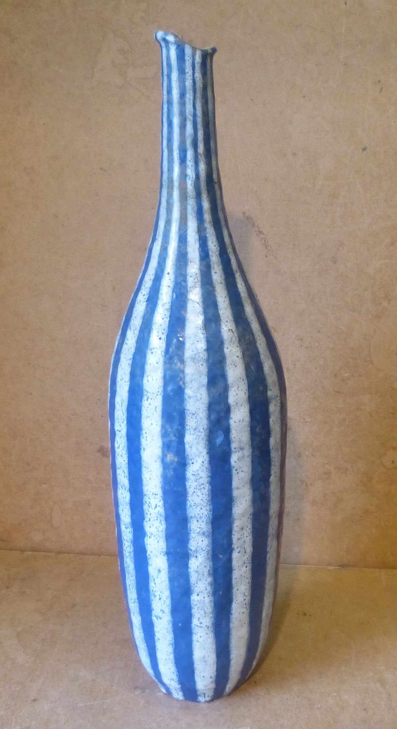 A Glazed Earthenware Studio Pottery Round Thin Neck Bottle on white and blue striped ground (neck restored) inscribed to base